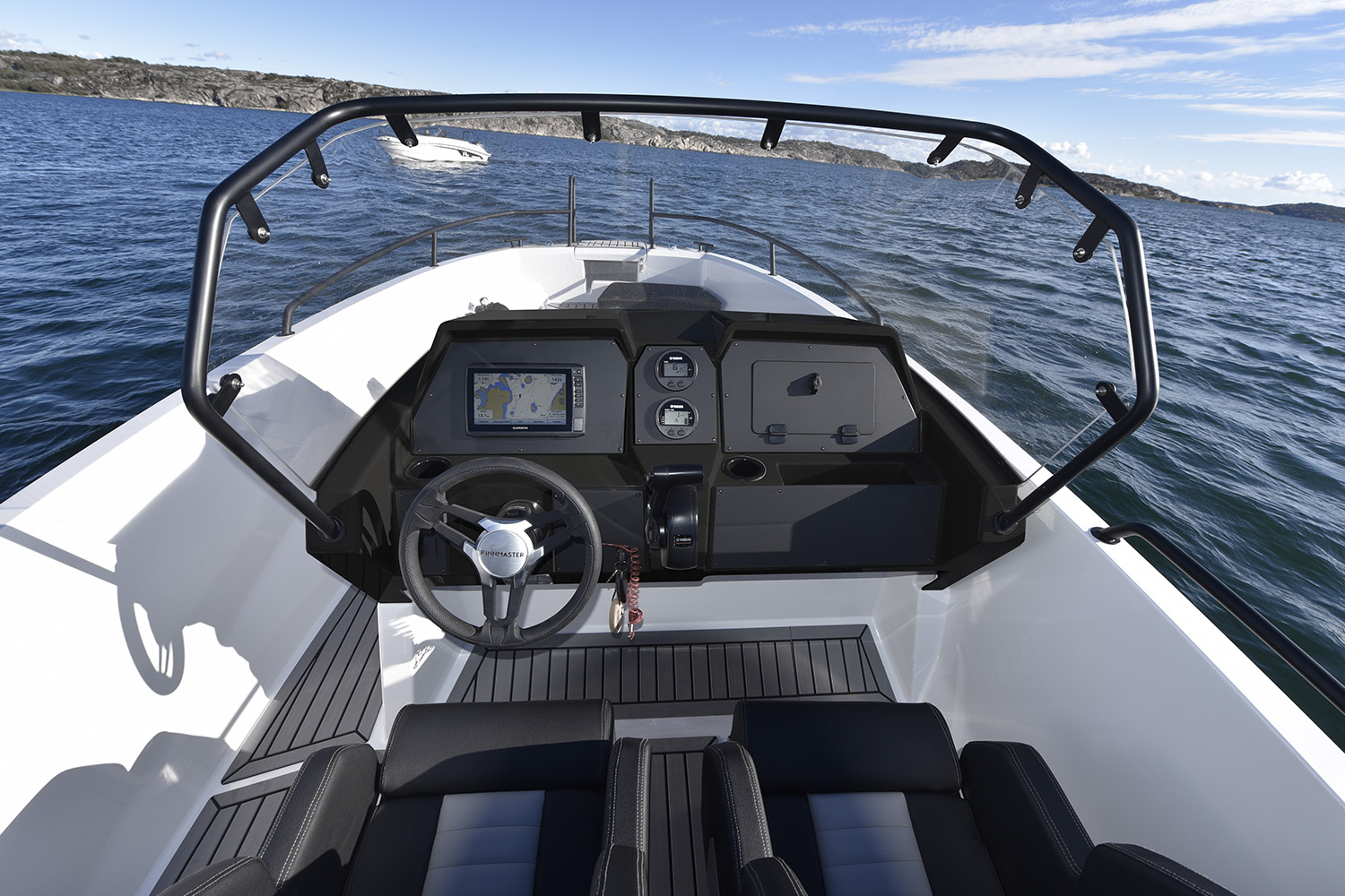 Finnmaster S6 är det perfekta mötet mellan sportighet och innovativa detaljer. I denna skärgårdsjeep kan du avnjuta sommardagarna till det maximala, tack vare sittplatserna och soldäcket som du lätt kan sätta upp i fören. Den breda styrpulpeten med den strömlinjeformade vindrutan garanterar att man sitter skyddad från vind även i högre fart. Vi har kryddat med många smarta detaljer som flera trappsteg för att underlätta ombordstigning, fenderhållare för att hålla ordning och reda på förtöjningsutrustning samt rejält med stuvutrymme för att du skall kunna ta med dig allt du behöver under dagen. Skenet från LED-lamporna i fören styr dig mot ändlösa äventyr på sjön.